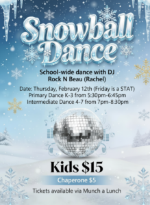 Date: Thursday, February 12th (Friday 13th is a Pro D Day, so no school!)
